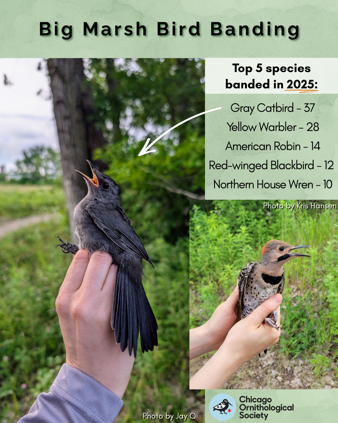 The most common species captured included the Gray Catbird (37 individuals), the Yellow Warbler (28 individuals), the American Robin (14 individuals), the Red-Winged Blackbird (12 individuals), and the Northern House Wren (10 individuals.) Of the birds captured, 19 had been previously banded in 2025, and 25 had been banded in previous years, illustrating these birds return to Big Marsh season after season.