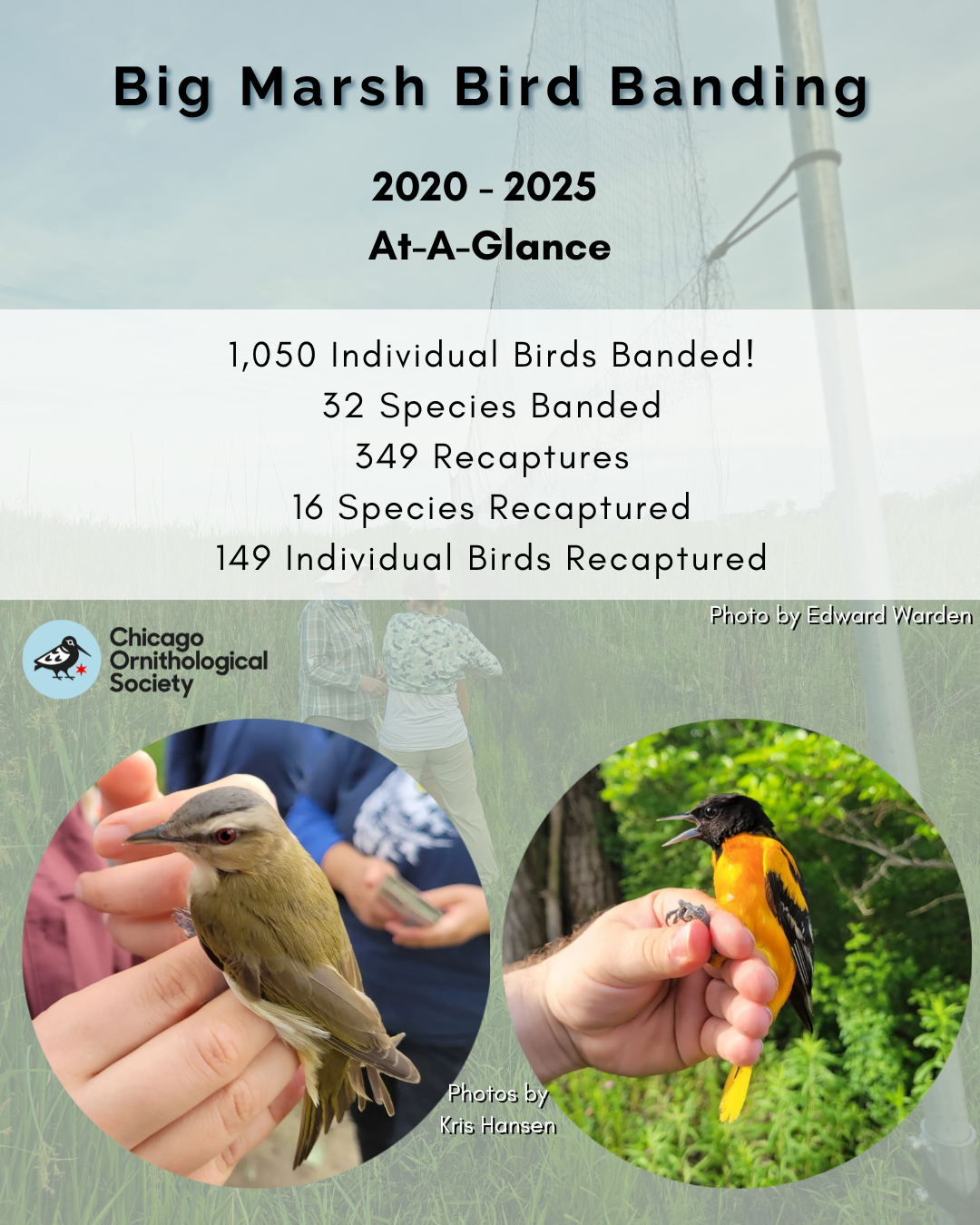 In 2025, the bird banding station at Big Marsh Park completed its sixth year of monitoring breeding populations on Chicago’s Far South Side. The station began in 2020, with the goal of identifying and monitoring the bird populations that pass through the South Side nature preserve during breeding season. Since the beginning of the station a total 1,050 birds, from 32 species, have been banded and released.